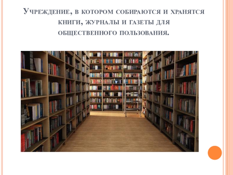 Слайд 10Учреждение, в котором собираются и хранятся книги, журналы и газеты для  общественного