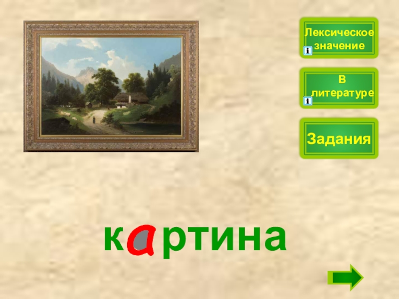 1.Произведение живописи в красках. 2.Кинематографическая картина фильма.3.Ряд образов, отличающихся наглядностью и образующих единое целое.