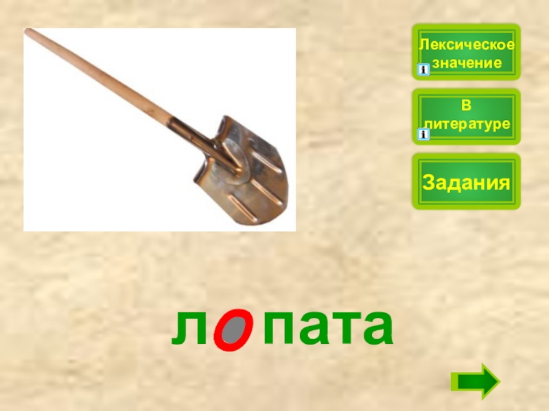Орудие с длинной рукояткой и широким плоским или слегка выгнутым концом для копания, насыпания и т. п.