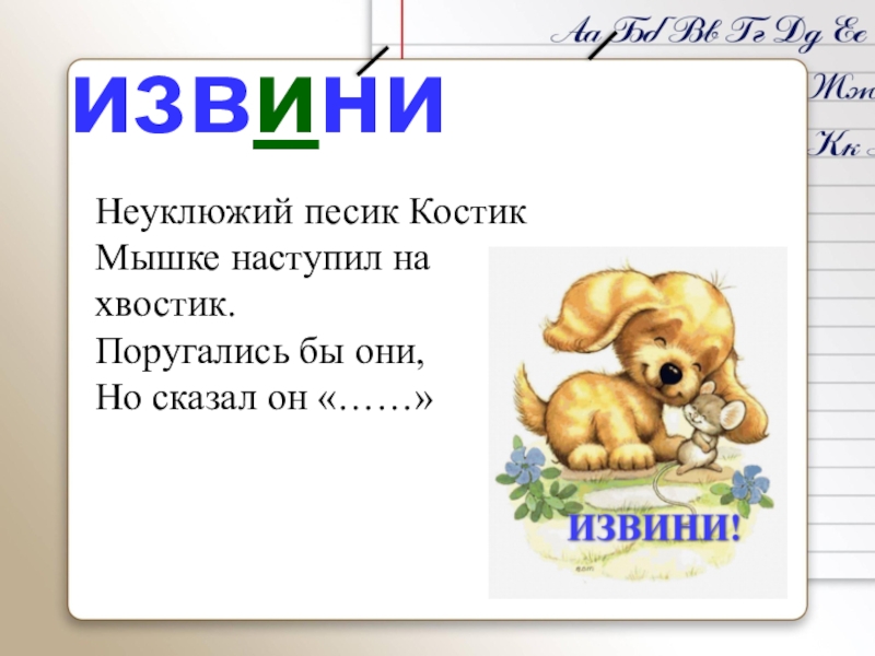 извиниНеуклюжий песик Костик Мышке наступил на хвостик. Поругались бы они, Но сказал он «……»