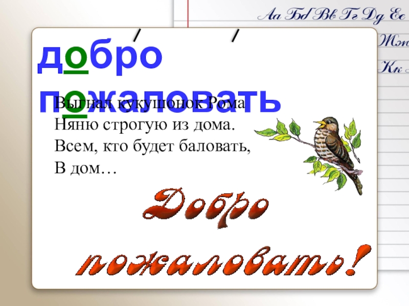 добро пожаловать     Выгнал кукушонок Рома Няню строгую из дома. Всем, кто будет баловать,