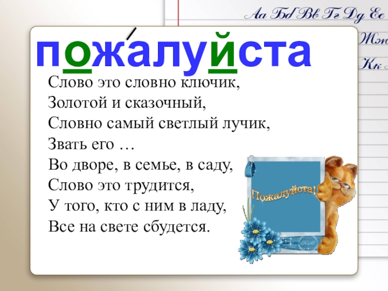 пожалуйстаСлово это словно ключик, Золотой и сказочный, Словно самый светлый лучик, Звать его …Во дворе, в семье,