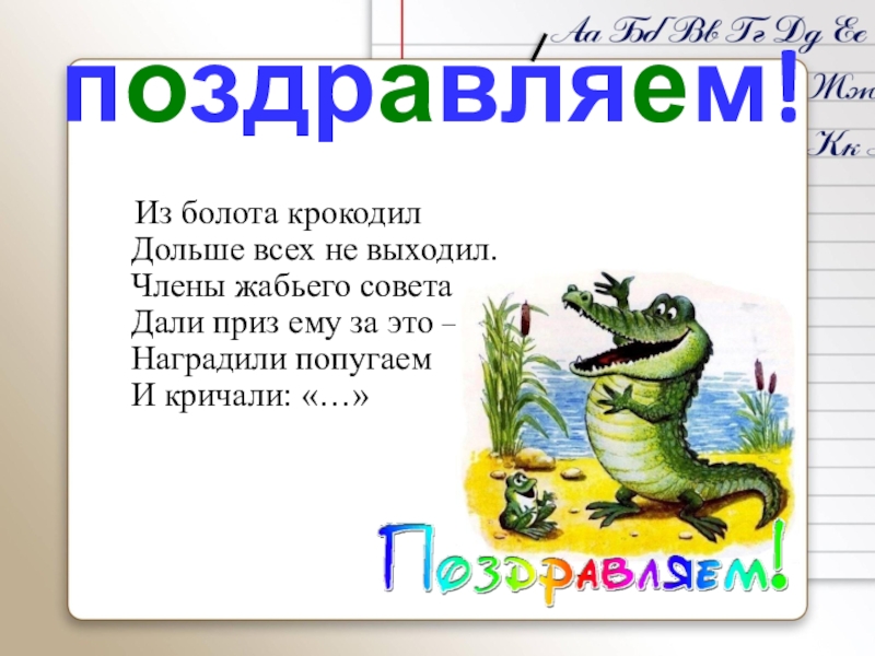 поздравляем!  Из болота крокодил Дольше всех не выходил. Члены жабьего совета Дали приз ему за это