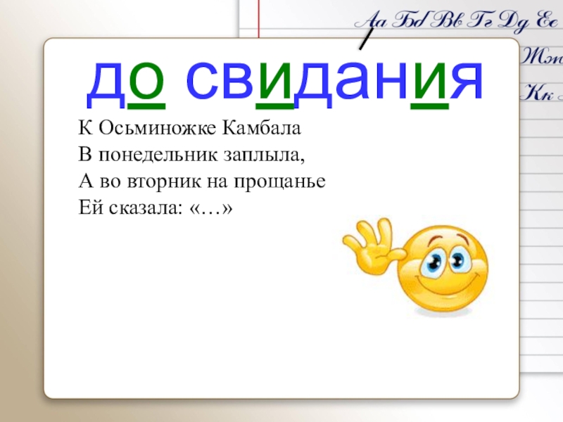 до свиданияК Осьминожке Камбала В понедельник заплыла, А во вторник на прощанье Ей сказала: «…»