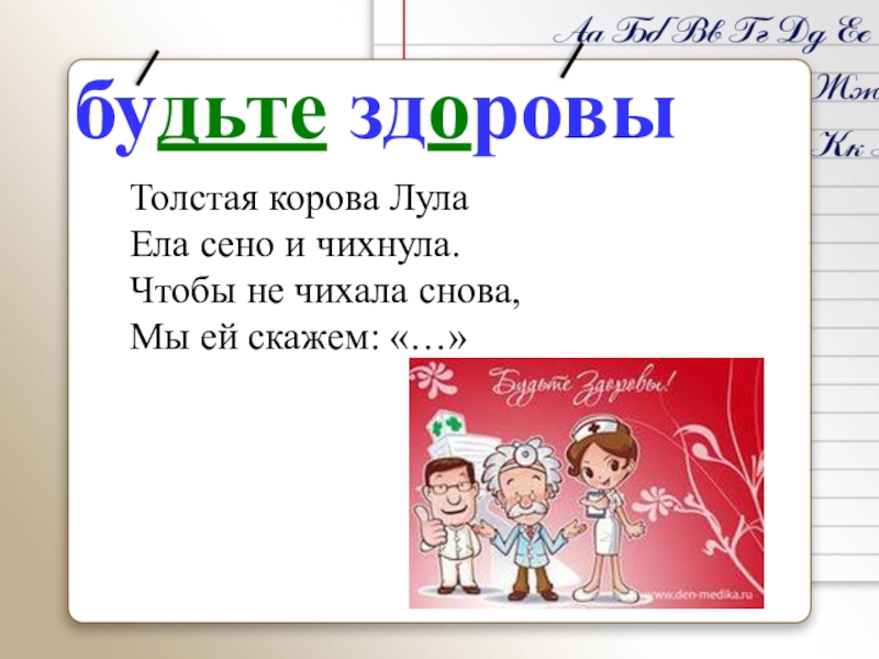 будьте здоровыТолстая корова Лула Ела сено и чихнула. Чтобы не чихала снова, Мы ей скажем: «…»