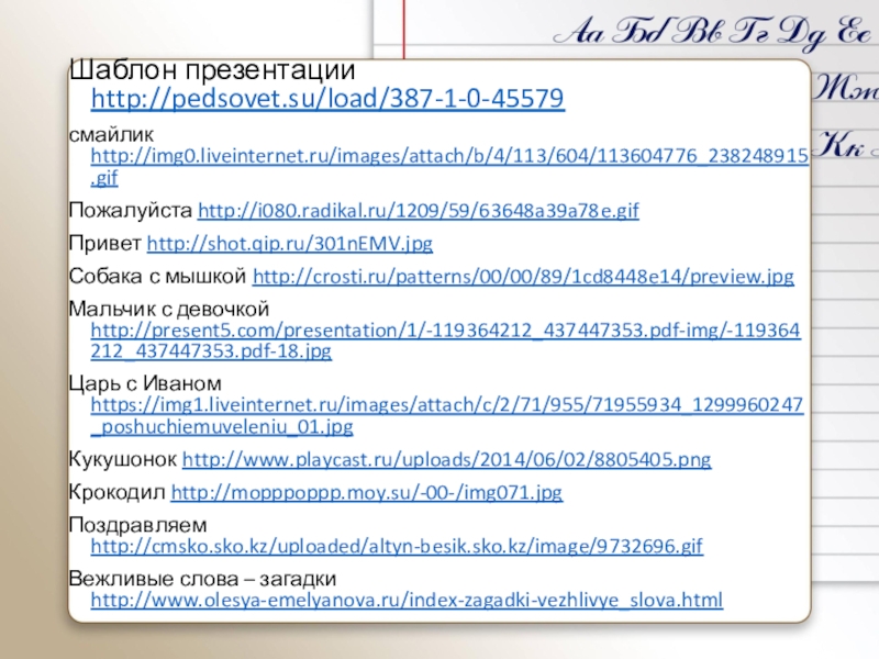 Шаблон презентации http://pedsovet.su/load/387-1-0-45579 смайлик http://img0.liveinternet.ru/images/attach/b/4/113/604/113604776_238248915.gif Пожалуйста http://i080.radikal.ru/1209/59/63648a39a78e.gif Привет http://shot.qip.ru/301nEMV.jpg Собака с мышкой http://crosti.ru/patterns/00/00/89/1cd8448e14/preview.jpg Мальчик с девочкой http://present5.com/presentation/1/-119364212_437447353.pdf-img/-119364212_437447353.pdf-18.jpg