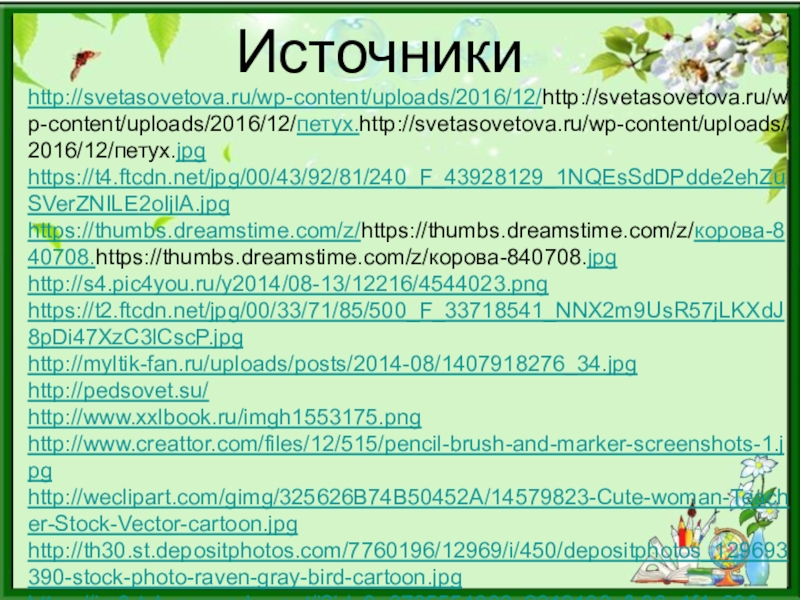 Источникиhttp://svetasovetova.ru/wp-content/uploads/2016/12/http://svetasovetova.ru/wp-content/uploads/2016/12/петух.http://svetasovetova.ru/wp-content/uploads/2016/12/петух.jpghttps://t4.ftcdn.net/jpg/00/43/92/81/240_F_43928129_1NQEsSdDPdde2ehZuSVerZNILE2oIjlA.jpghttps://thumbs.dreamstime.com/z/https://thumbs.dreamstime.com/z/корова-840708.https://thumbs.dreamstime.com/z/корова-840708.jpghttp://s4.pic4you.ru/y2014/08-13/12216/4544023.pnghttps://t2.ftcdn.net/jpg/00/33/71/85/500_F_33718541_NNX2m9UsR57jLKXdJ8pDi47XzC3lCscP.jpghttp://myltik-fan.ru/uploads/posts/2014-08/1407918276_34.jpghttp://pedsovet.su/ http://www.xxlbook.ru/imgh1553175.pnghttp://www.creattor.com/files/12/515/pencil-brush-and-marker-screenshots-1.jpghttp://weclipart.com/gimg/325626B74B50452A/14579823-Cute-woman-Teacher-Stock-Vector-cartoon.jpghttp://th30.st.depositphotos.com/7760196/12969/i/450/depositphotos_129693390-stock-photo-raven-gray-bird-cartoon.jpghttps://im0-tub-ru.yandex.net/i?id=9e3735554803e2312193afb98a1f4c69&n=33&h=215&w=294