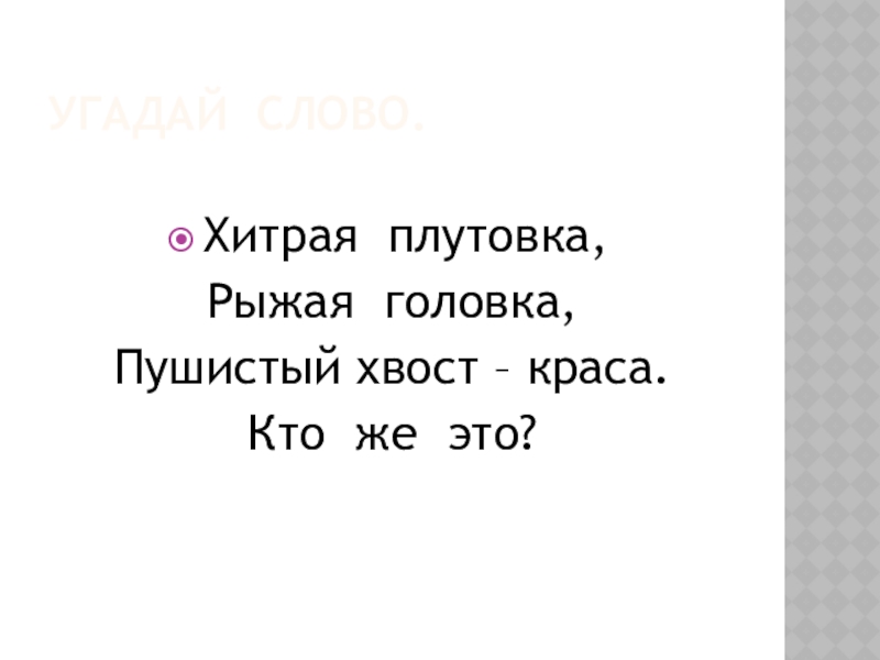 Угадай слово.Хитрая плутовка,Рыжая головка,Пушистый хвост – краса.Кто же это?