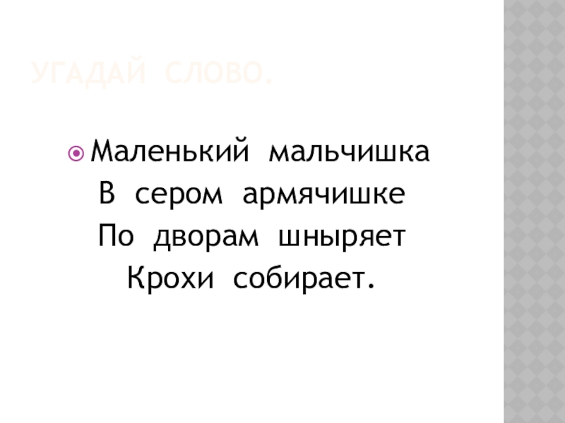Угадай слово.Маленький мальчишкаВ сером армячишкеПо дворам шныряетКрохи собирает.