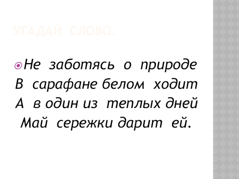 Угадай слово.Не заботясь о природе В сарафане белом ходитА в один из теплых днейМай сережки дарит ей.