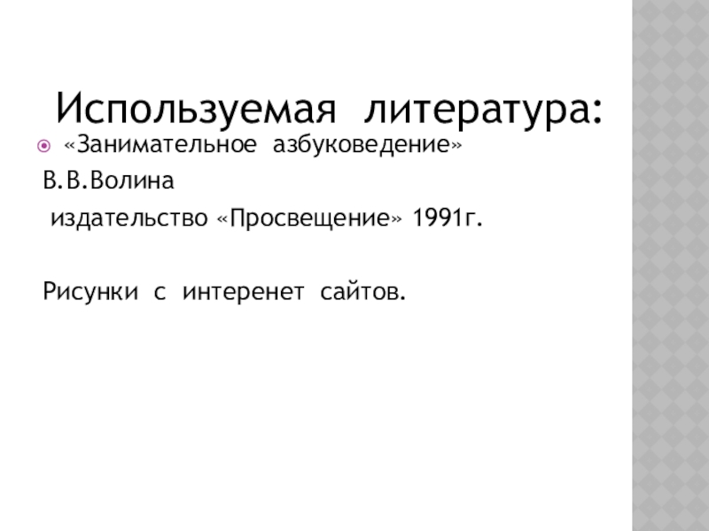 Используемая литература:«Занимательное азбуковедение»В.В.Волина издательство «Просвещение» 1991г.Рисунки с интеренет сайтов.