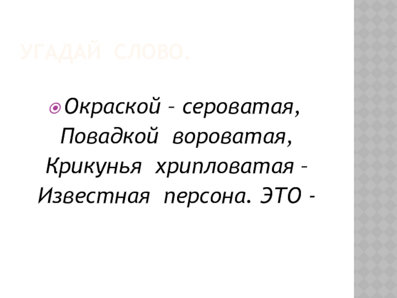 Угадай слово.Окраской – сероватая,Повадкой вороватая,Крикунья хрипловатая –Известная персона. ЭТО -