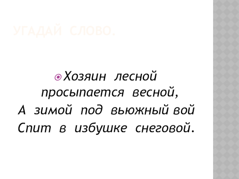 Угадай слово.Хозяин лесной просыпается весной,А зимой под вьюжный войСпит в избушке снеговой.