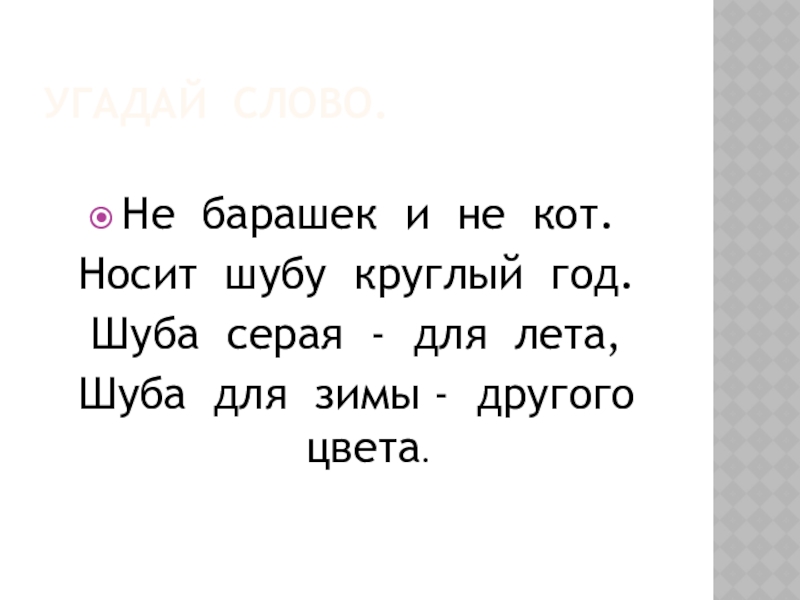 Угадай слово.Не барашек и не кот.Носит шубу круглый год.Шуба серая - для лета,Шуба для зимы - другого