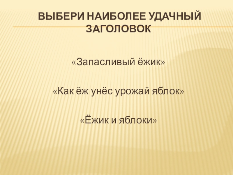 Выбери наиболее удачный заголовок   «Запасливый ёжик»«Как ёж унёс урожай яблок» «Ёжик и яблоки»