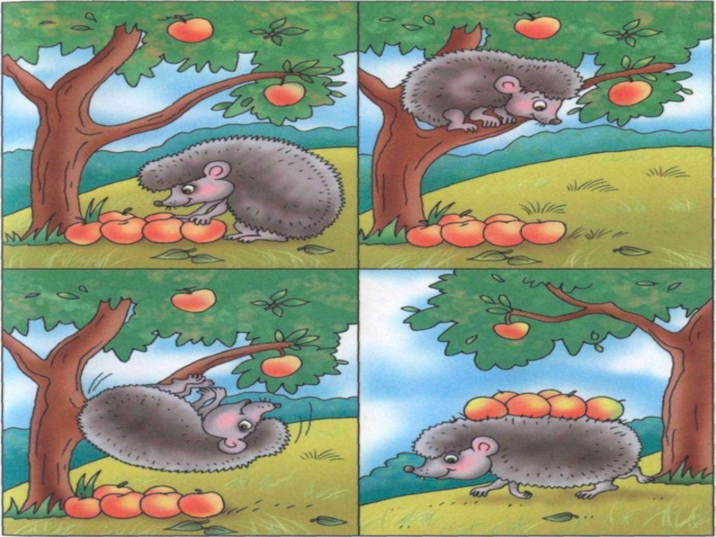 Ответь на вопросы Какое время года изображено на картинках? Как ты догадался?  Что делает ёжик?  Что придумал зверёк, чтобы сразу унести все яблоки?  Как ты думаешь, зачем ёжику столько яблок?