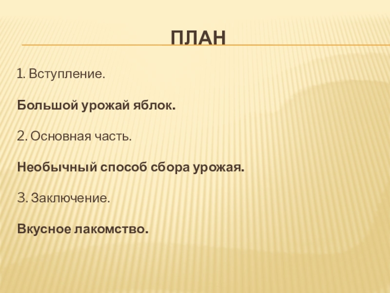 План1. Вступление. Большой урожай яблок. 2. Основная часть. Необычный способ сбора урожая. 3. Заключение. Вкусное лакомство.