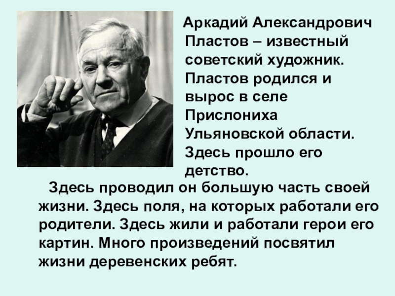 Аркадий Александрович Пластов – известный советский художник. Пластов родился и вырос в селе Прислониха Ульяновской области. Здесь прошло его детство.
