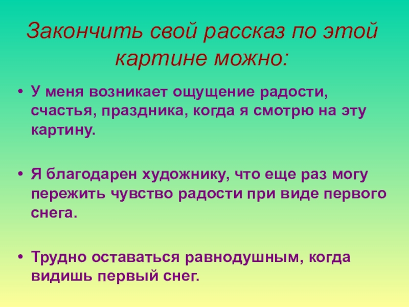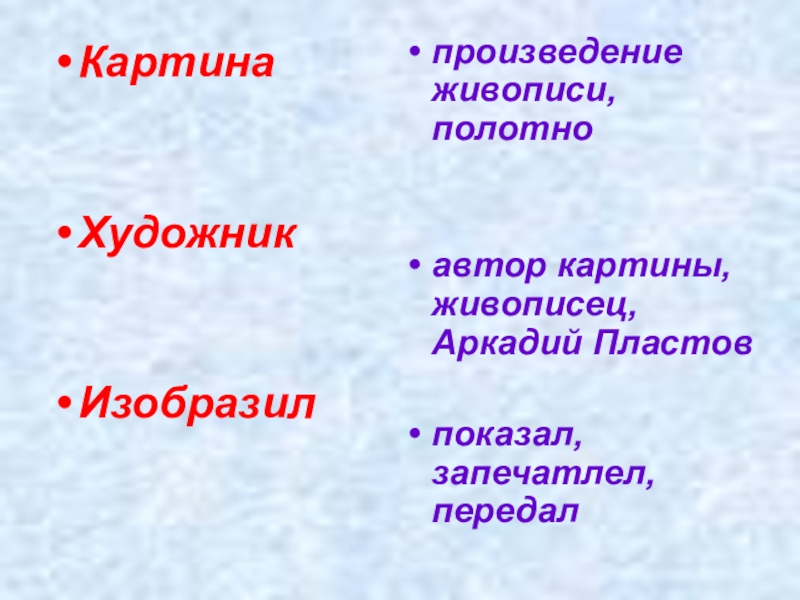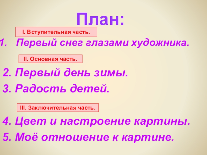 Снег: белый, пушистый, падает мохнатыми хлопьями, надел меховые шапки на крыши домов, укутал всю землю белоснежным ковром, медленно кружится в воздухе, как стая белых мошек, чистый.