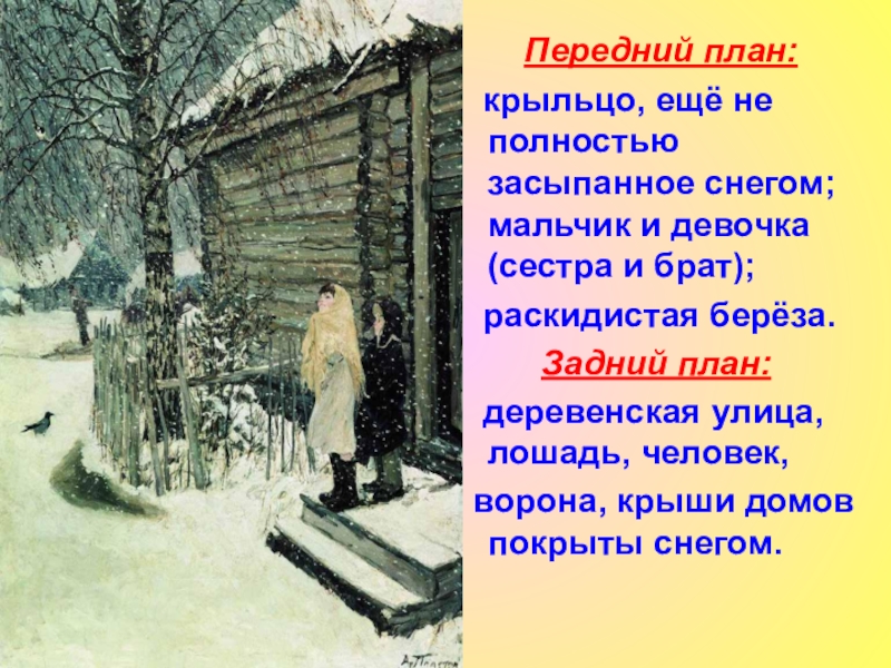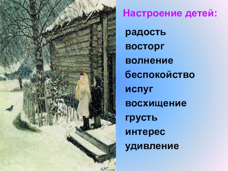 Девочка: в бело-розовом платьице; большие чёрные валенки; без пальто выбежала на крыльцо; с удивлением наблюдает; восхищённо смотрит; заворожённо смотрит на снег; лёгкий платок
