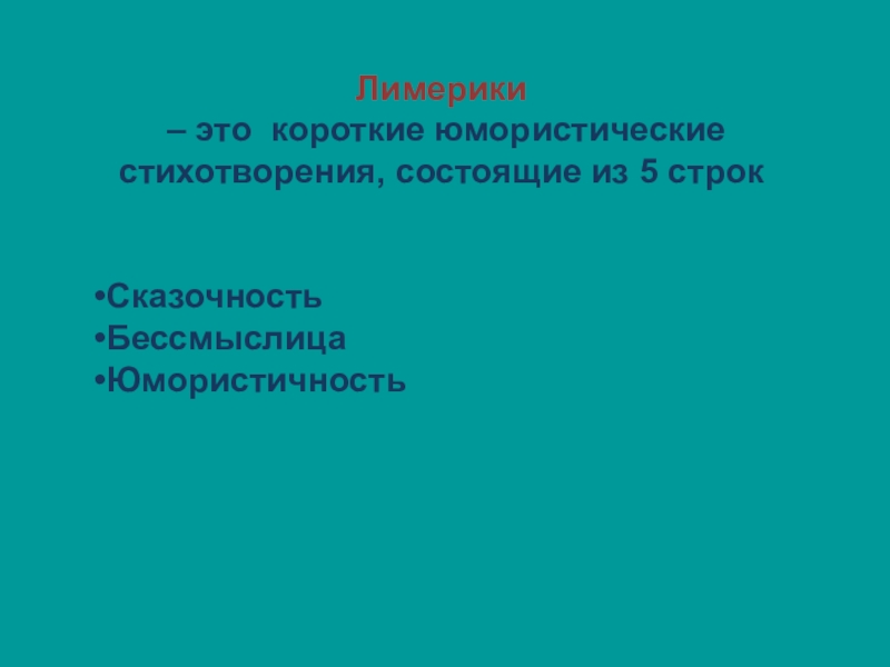 Лимерики – это короткие юмористические стихотворения, состоящие из 5 строкСказочностьБессмыслицаЮмористичность