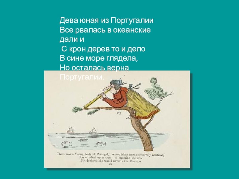Дева юная из ПортугалииВсе рвалась в океанские дали и С крон дерев то и делоВ сине море