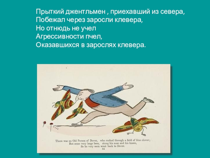 Прыткий джентльмен , приехавший из севера,Побежал через заросли клевера,Но отнюдь не учелАгрессивности пчел,Оказавшихся в зарослях клевера.