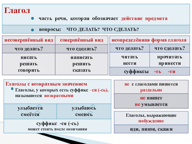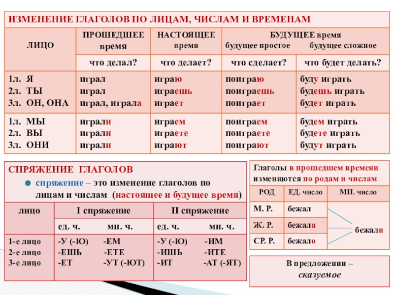 - глагол (изменение глаголов по лицам, числам и временам; спряжение глаголов)