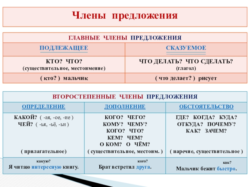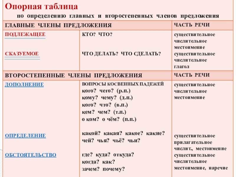 - Опорная таблица по определению главных и второстепенных членов предложения