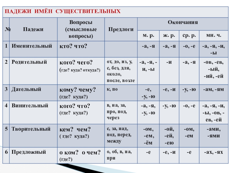 - Части речи:: - имя существительное (падежи имен существительных; три склонения существительных)