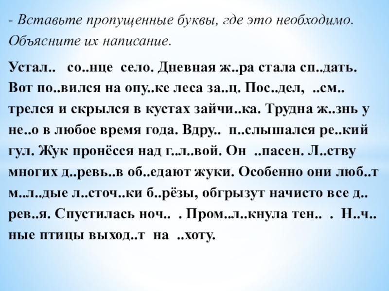 со..нце село. Дневная ж..ра стала сп..дать. Вот по..вился на опу..ке леса за..ц. Пос..дел, ..см..трелся и скрылся в кустах зайчи..ка. Трудна ж..знь у не..о в любое время года. Вдру.. п..слышался ре..кий гул. Жук пронёсся над г..л..вой. Он ..пасен. Л..ству многих д..ревь..в об..едают жуки. Особенно они люб..т м..л..дые л..сточ..ки б..рёзы, обгрызут начисто все д..рев..я. Спустилась ноч.. . Пром..л..кнула тен.. . Н..ч..ные птицы выход..т на ..хоту.