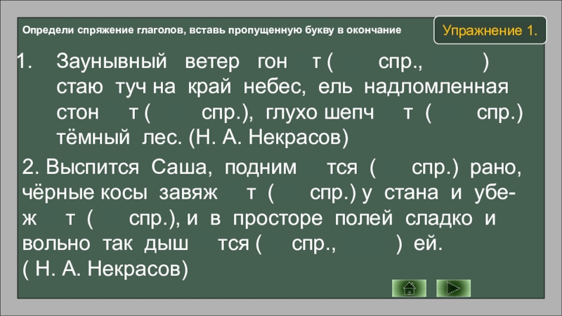 2. Выспится Саша, подним ... тся ( ... спр.) рано, чёрные косы завяж ... т ( ... спр.) у стана и убе- ж ... т ( ... спр.), и в просторе полей сладко и вольно так дыш ... тся ( ... спр., ____ ) ей. ( Н. А. Некрасов)