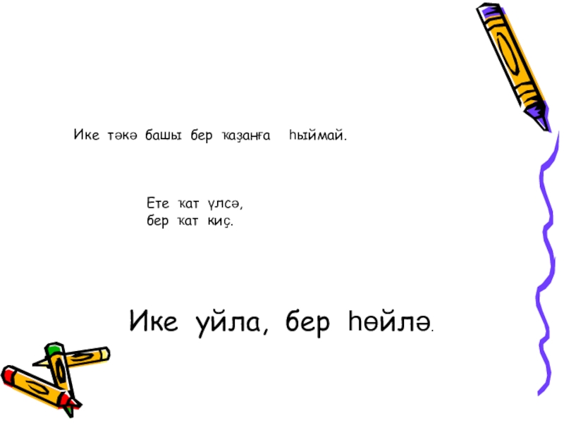Ике уйла, бер һөйлә.һыймай.Ике тәкә башы бер ҡаҙанға Ете ҡат үлсә, бер ҡат киҫ.