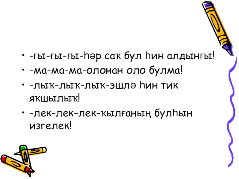 -ғы-ғы-ғы-һәр саҡ бул һин алдынғы!-ма-ма-ма-олонан оло булма!-лыҡ-лыҡ-лыҡ-эшлә һин тик яҡшылыҡ!-лек-лек-лек-ҡылғаның булһын изгелек!