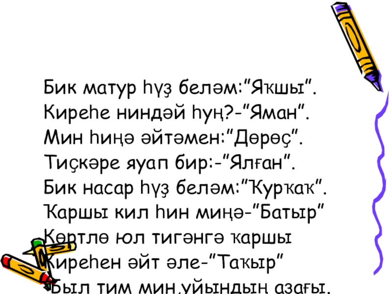 Бик матур һүҙ беләм:”Яҡшы”.Киреһе ниндәй һуң?-”Яман”.Мин һиңә әйтәмен:”Дөрөҫ”.Тиҫкәре яуап бир:-”Ялған”.Бик насар һүҙ беләм:”Ҡурҡаҡ”.Ҡаршы кил һин миңә-”Батыр”Көртлө юл
