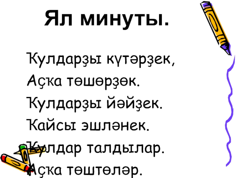 Ял минуты.Ҡулдарҙы күтәрҙек,Аҫҡа төшөрҙөк.Ҡулдарҙы йәйҙек.Ҡайсы эшләнек.Ҡулдар талдылар.Аҫҡа төштөләр.Иркен тын алдыҡ.Парты артына ултырҙыҡ.