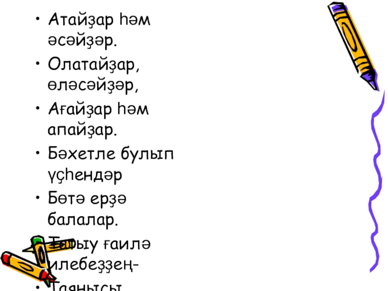 Атайҙар һәм әсәйҙәр.Олатайҙар,өләсәйҙәр,Ағайҙар һәм апайҙар.Бәхетле булып үҫһендәрБөтә ерҙә балалар.Татыу ғаилә илебеҙҙең-Таянысы терәге.