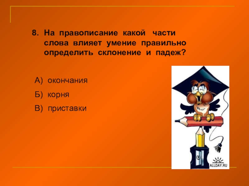 На правописание какой  части слова влияет умение правильно определить склонение и падеж?А) окончанияБ) корняВ) приставки