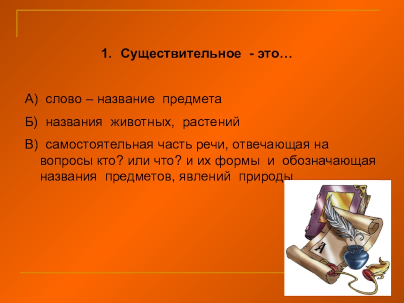 Существительное - это…А) слово – название предметаБ) названия животных, растенийВ) самостоятельная часть речи, отвечающая на вопросы кто?