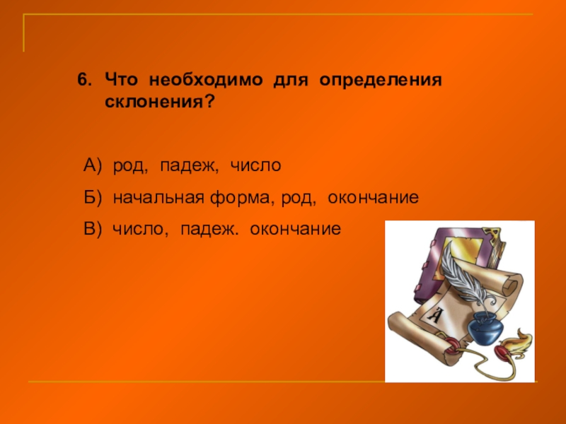 Что необходимо для определения склонения?А) род, падеж, числоБ) начальная форма, род, окончаниеВ) число, падеж. окончание