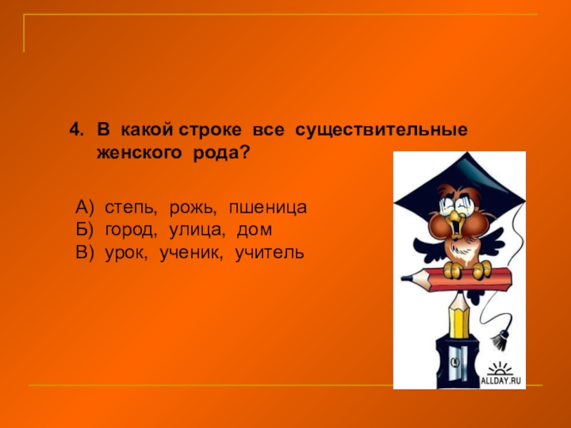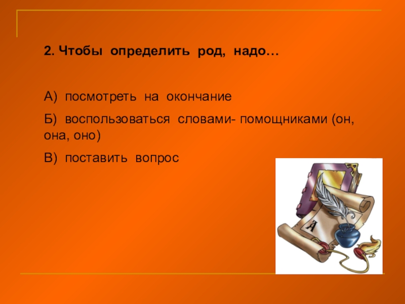 2. Чтобы определить род, надо…А) посмотреть на окончаниеБ) воспользоваться словами- помощниками (он, она, оно)В) поставить вопрос