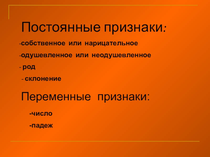 Постоянные признаки: собственное или нарицательноеодушевленное или неодушевленное род- склонениеПеременные признаки:-число-падеж
