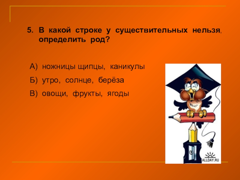 В какой строке у существительных нельзя, определить род?А) ножницы щипцы, каникулыБ) утро, солнце, берёзаВ) овощи, фрукты, ягоды