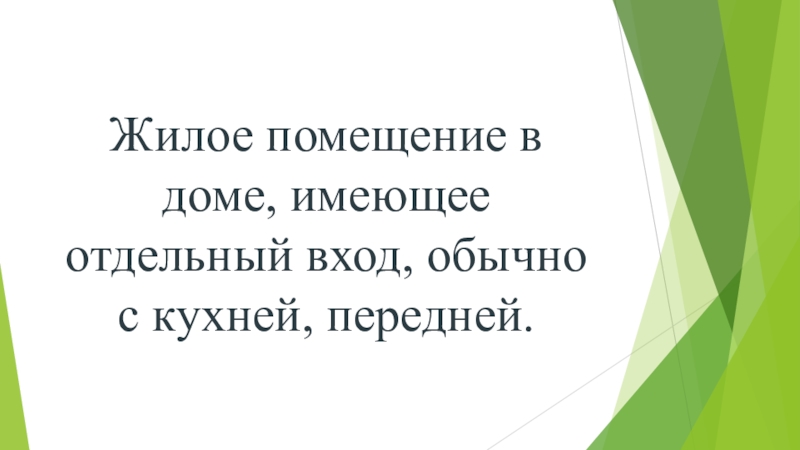 Слайд 12 Жилое помещение в доме, имеющее отдельный вход, обычно с кухней, передней.