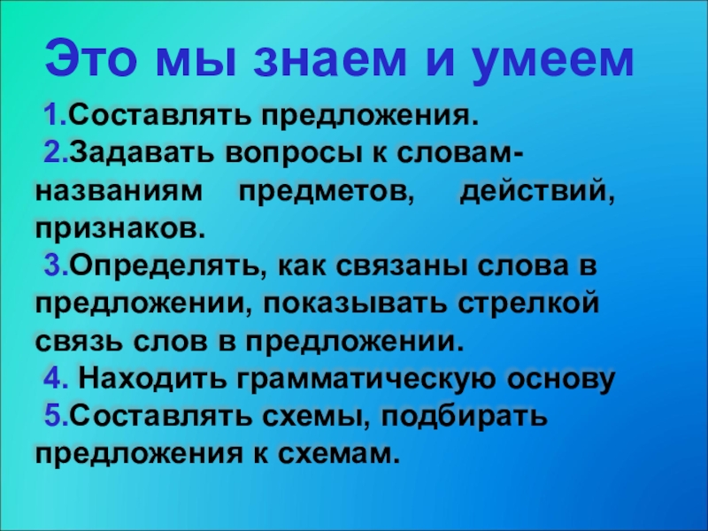 Это мы знаем и умеем 1.Составлять предложения. 2.Задавать вопросы к словам-названиям  предметов,   действий, признаков. 3.Определять, как