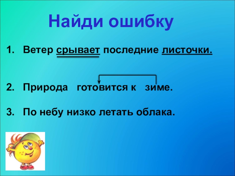 Найди ошибкуВетер срывает последние листочки.Природа  готовится к  зиме.По небу низко летать облака.
