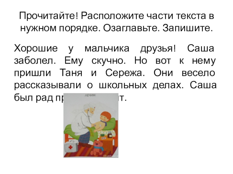 Прочитайте! Расположите части текста в нужном порядке. Озаглавьте. Запишите.Хорошие у мальчика друзья! Саша заболел. Ему скучно. Но
