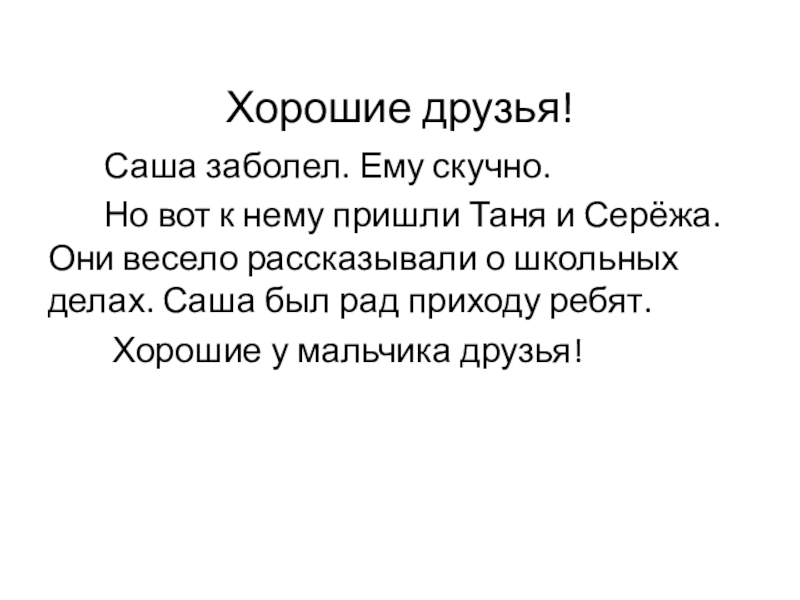 друзья! Саша заболел. Ему скучно. Но вот к нему пришли Таня и Сережа. Они весело рассказывали о школьных делах. Саша был рад приходу ребят.