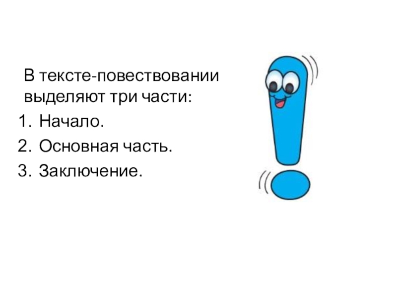 В тексте-повествовании выделяют три части:Начало.Основная часть.Заключение.