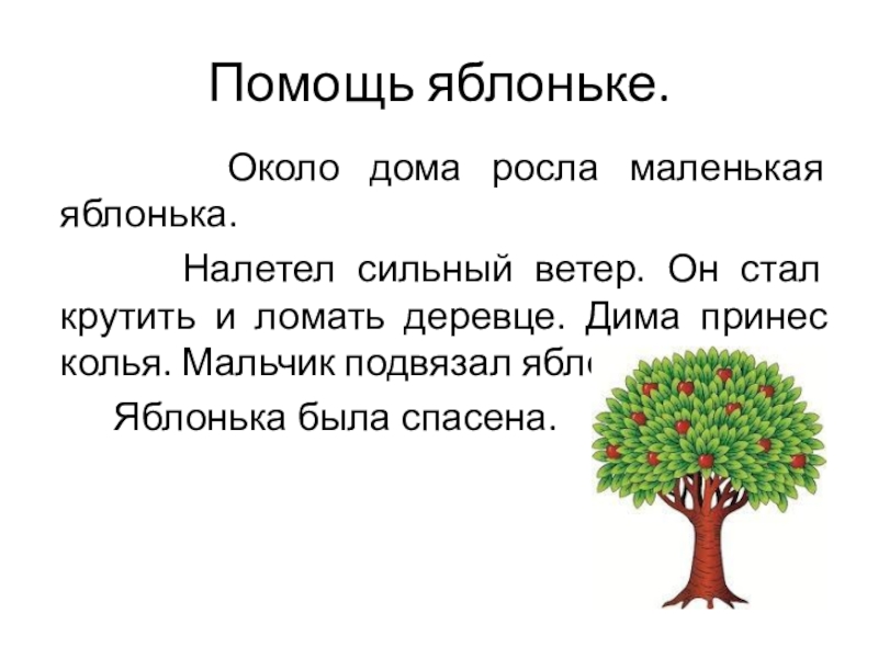 Помощь яблоньке.   Около дома росла маленькая яблонька.    Налетел сильный ветер. Он стал